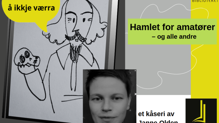 Tingvoll bibliotek onsdag 29. april kl. 19.00. Hamlet av William Shakespeare er et av verdens mest kjente og spilte teaterstykker. I dette kåseriet av Janne Olden blir du kjent med både han som skrev stykket, og med prins Hamlet selv og den relativt brokete forsamlingen han omgir seg med – her er både pene damer, hodeskaller og gjenferd.