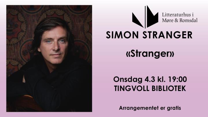 Tingvoll bibliotek onsdag 4. mars kl. 19.00 Suksessforfatteren Simon Strangers nye roman Stranger er en personlig og sann historie om adopsjon, psykisk sykdom og om hemmelighetene i en familie. Det er også en historie om å seile over Atlanterhavet i en liten båt som gradvis går i stykker.